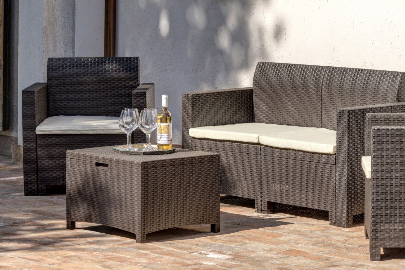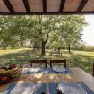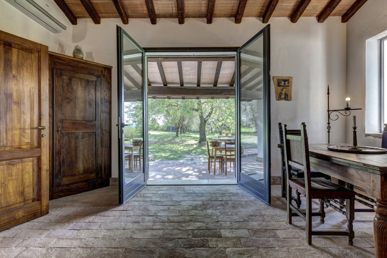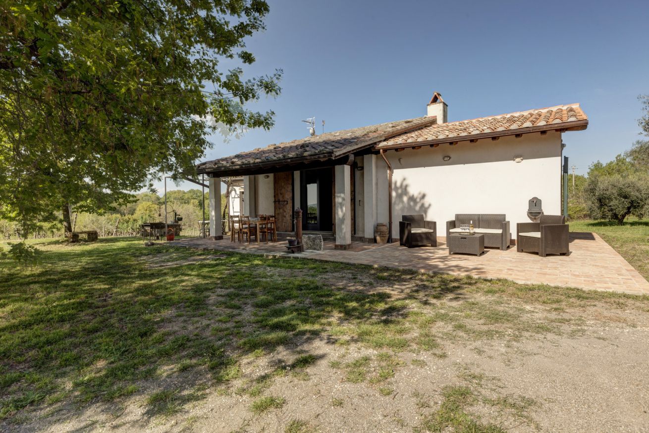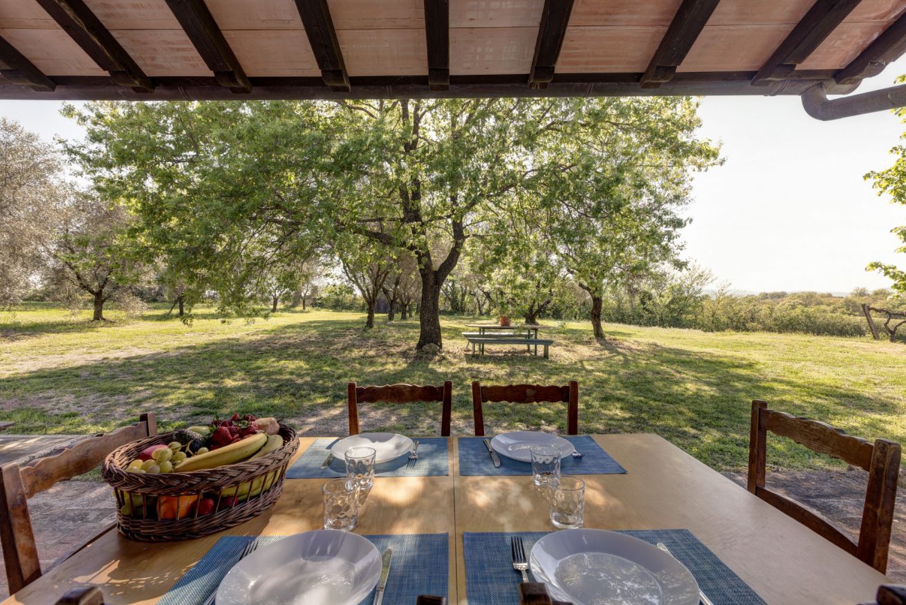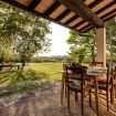 The porch offers a large covered wooden veranda, furnished with a table and chairs for outdoor lunches and dinners, protected by the natural coolness, as well as a spacious terracotta terrace with wicker sofas, perfect for sipping a glass of local wine at sunset.
