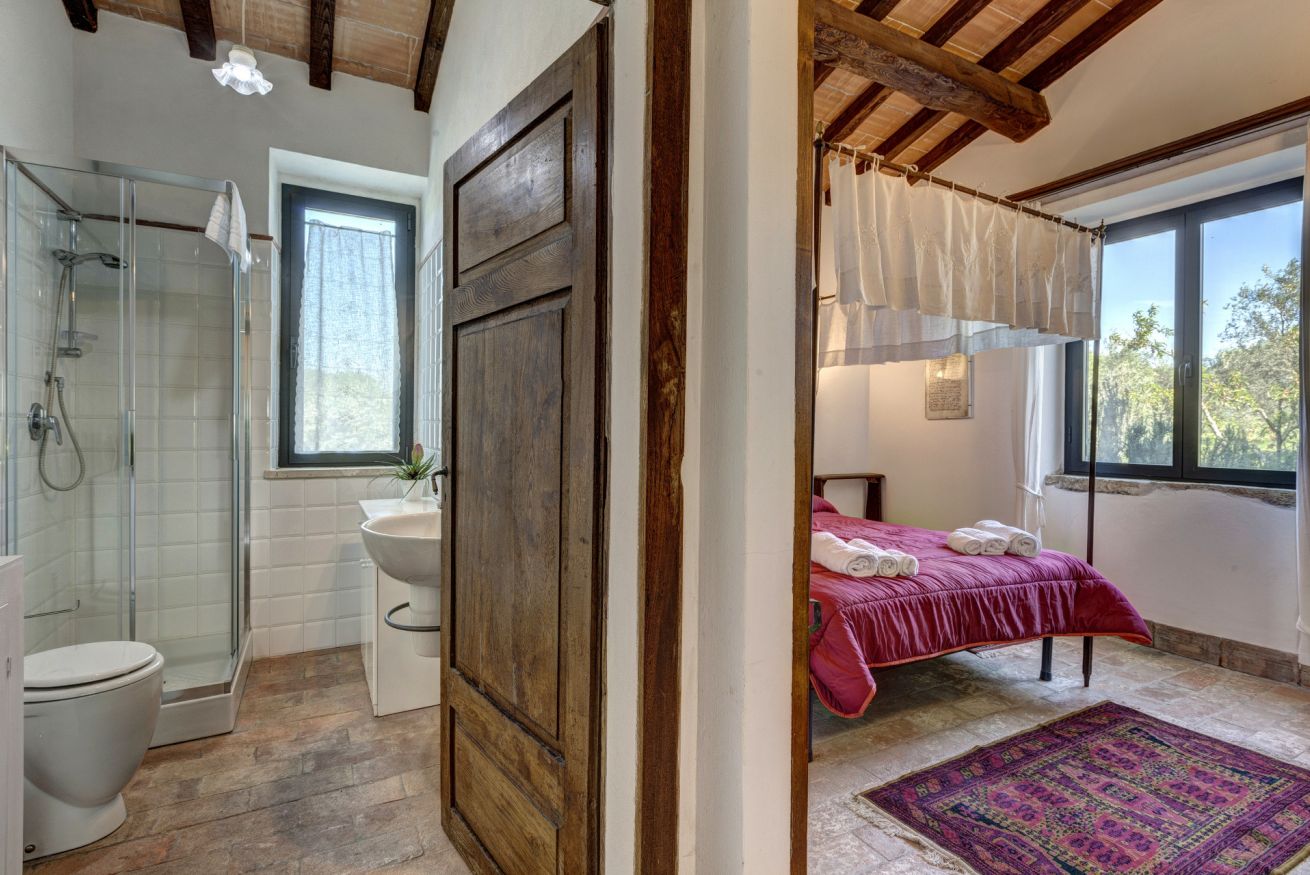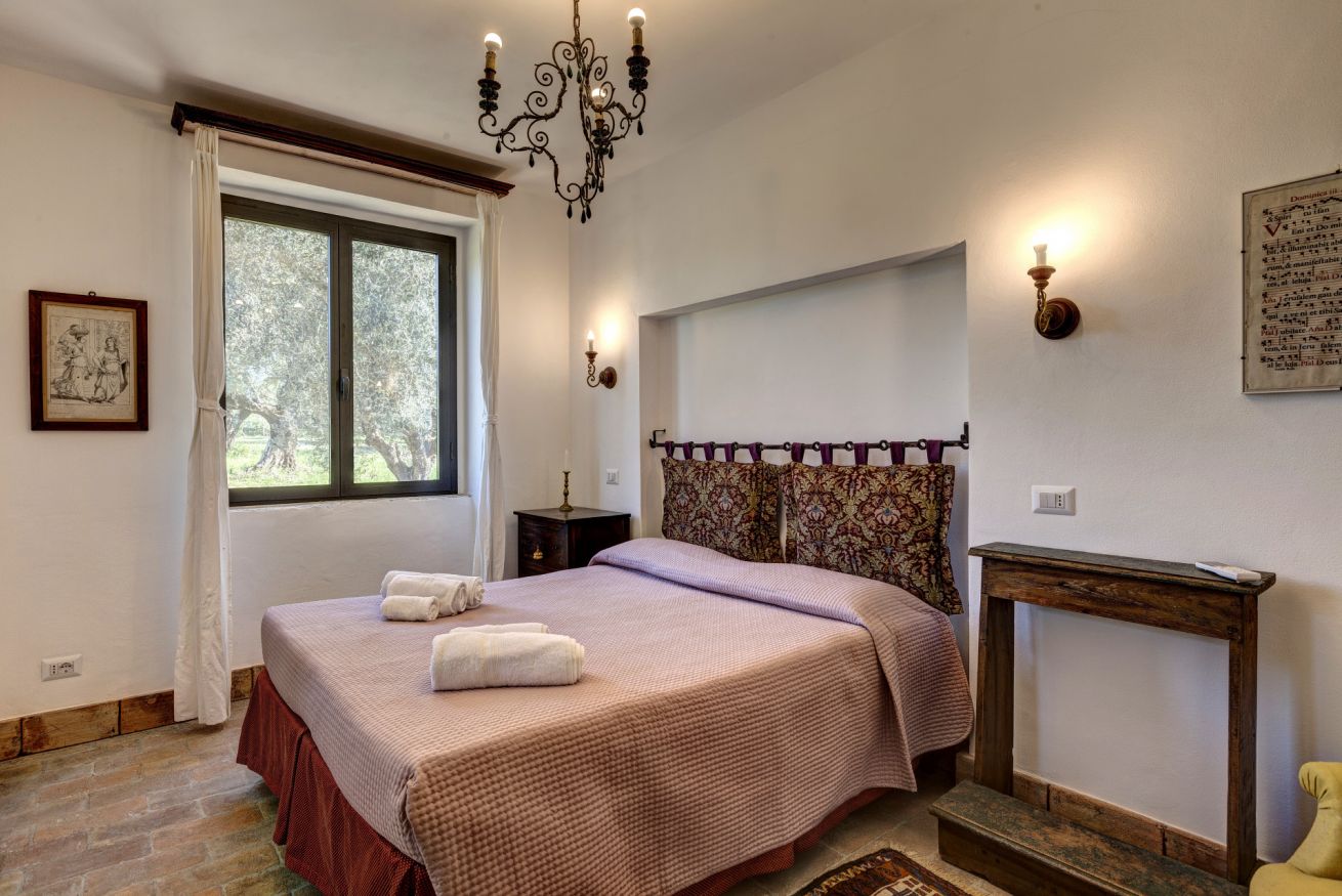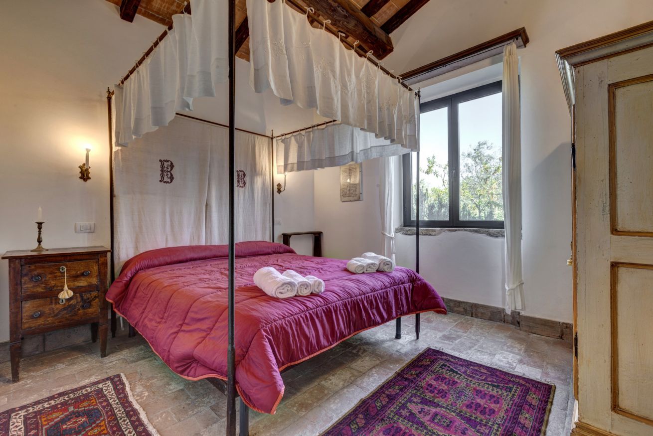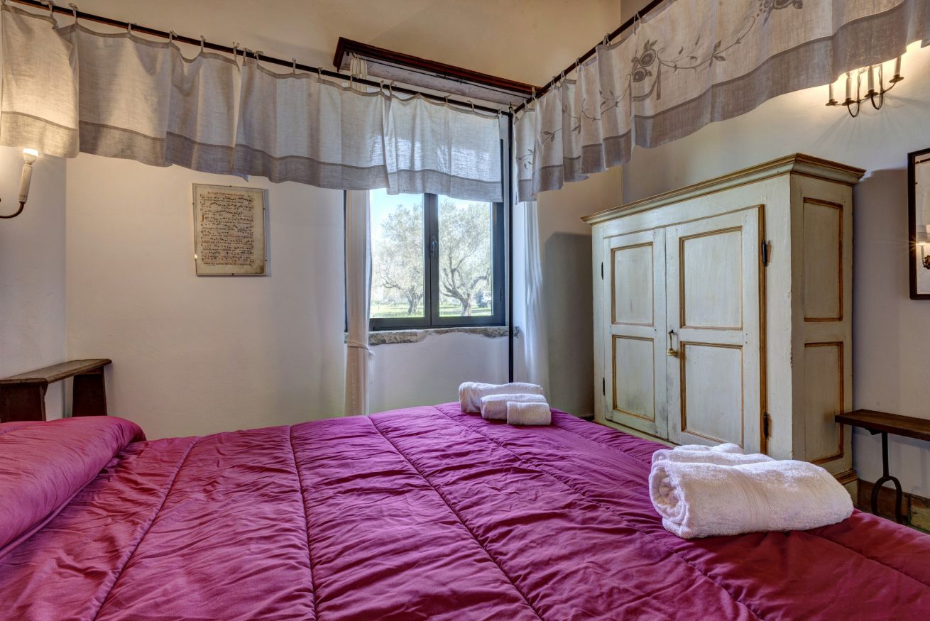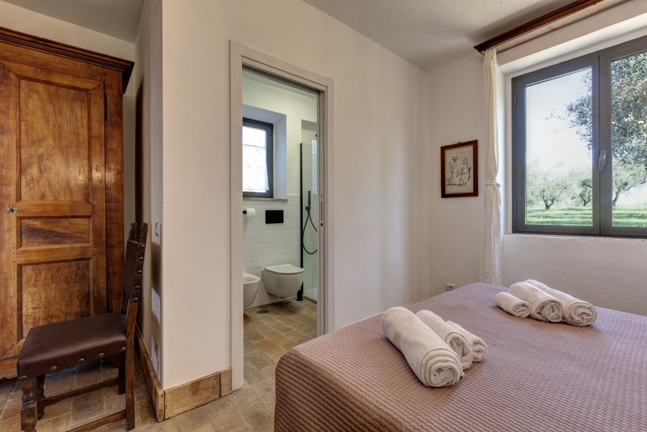The bedrooms are spacious and airy, furnished with period furniture and a touch of "arte povera" that recalls peasant traditions. The large windows offer a priceless view of the surrounding vineyards and olive groves.