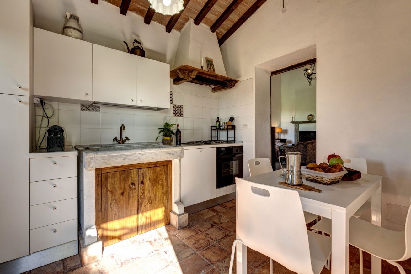 A large and bright living room with a grand stone fireplace is the heart of the home, ideal for cooler evenings. Comfortable sofas and a large dining table create the perfect setting for spending time with family or friends. The kitchen combines a functional space full of character, where you can enjoy cooking typical local products.