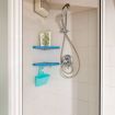 The sleeping area, separated from the living room by a small wall, offers a comfortable double bed, while a second mezzanine area houses another double bed, ideal for privacy and space. The full bathroom with shower also includes a washing machine, perfect for longer stays.