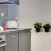 The entrance opens onto a bright living area with a fully equipped open-plan kitchen, perfect for preparing meals independently. The spacious and welcoming living room features a pull-out double sofa bed, ideal for accommodating additional guests.