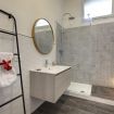 The sleeping area consists of a bedroom with a double bed and a spacious bathroom with a large walk-in shower.