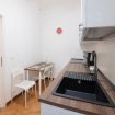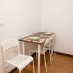 The apartment offers a double bedroom with a comfortable desk, a sitting area with a sofa bed suitable for one person, and a kitchen with a dining table and chairs, fully equipped with induction hob, coffee maker and microwave. The bathroom is complete and equipped with shower.