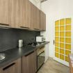 From the living room, a door leads to a small but well equipped kitchen. Here you will find everything you need for your stay: a gas hob with four burners, electric oven, microwave, refrigerator and kettle and a washing machine for maximum convenience.